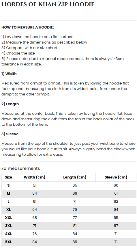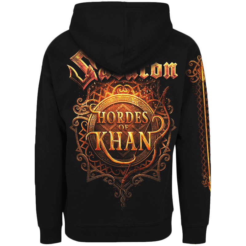 Introducing our official “Hordes Of Khan” zip hoodie in black, inspired by Sabaton’s single of the same name. This hoodie features a striking gold logo with traditional Mongolian folklore elements on the back, as well as details on the sleeve and breast.