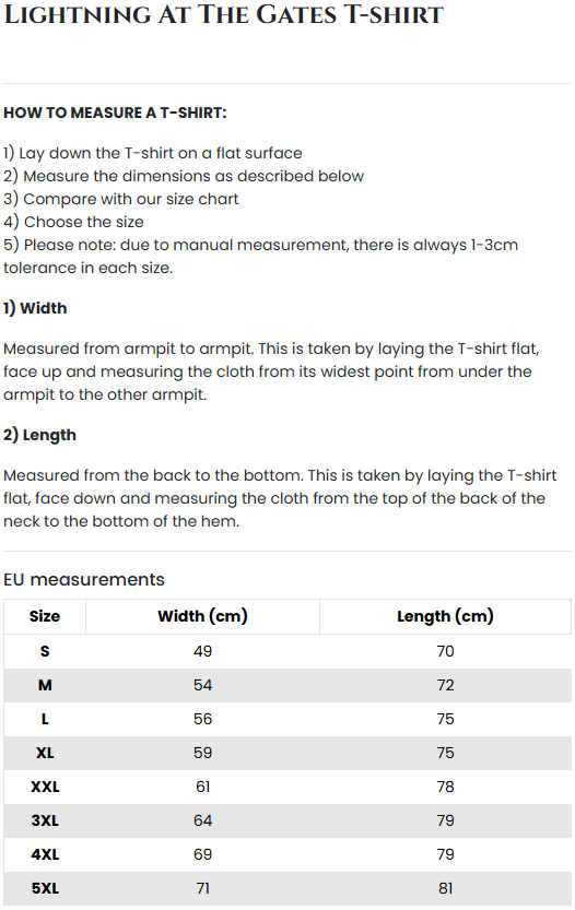 Get our “Lightning At The Gates” t-shirt which features Hannibal Barca on a battle elephant on the front and the text “Hannibal Ad Portas” on the back. Artwork inspired by the Lightning At The Gates song from the new upcoming album - Legends.